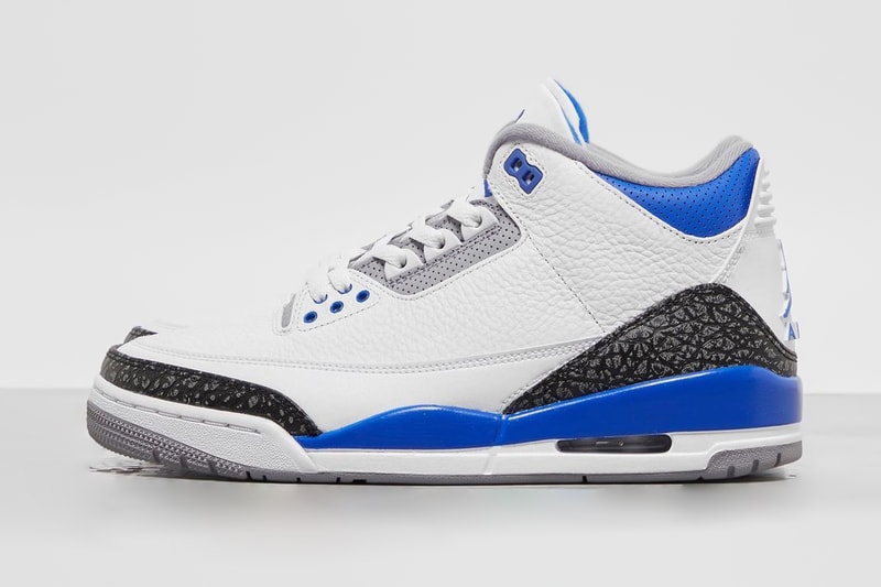 After officially being revealed a few months back, we now have another look at the Air Jordan 3 “Racer Blue.”Complete with the accompanying shoebox, the latest images reveal the details of the upcoming “White/Black-Cement Grey-Racer Blue” colorway. The upper of the shoe features a mainly tumbled leather construction paired with 3M reflective elephant print, smooth white leather and perforated hits of blue and gray. The contrasting blue highlights also appear on the eyelets and branding. Rounding up the design of the shoe are gray sockliners, printed insoles and white/blue Air-assisted midsoles with gray rubber outsoles.Priced at $190 USD, the Air Jordan 3 “Racer Blue” is now set to release at select retailers July 10.For more footwear news, take a first look at another fragment design x sacai x Nike LDWaffle colorway.