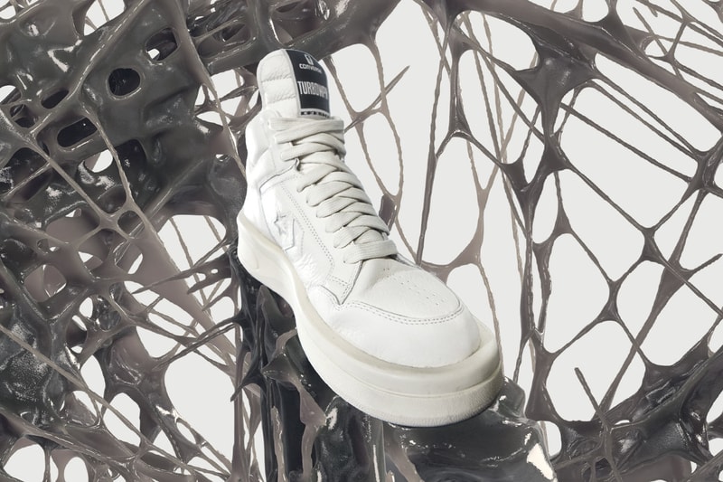 Following the reintroduction of the collaborative low-top DRKSTARs, Rick Owens DRKSHDW and Converse join forces once again for two new monochromatic takes on the DRKSHDW TURBOWPN silhouette.The TURBOWPN is a reimagined version of the Converse Weapon, a basketball shoe that commanded the hardwood in the late ’80s, worn by icons such as Magic Johnson and Larry Bird. For its second release, the TURBOWPN sneakers are introduced in “Clay” and “Egret” colorways featuring distorted and exaggerated proportions including an elongated tongue, puffed collars, and stretched platform soles. Uppers arrive in a full premium leather build with DRKSHDW’s star sign etched on the laterals, and Converse’s logo imprinted on the medial sides.In addition to footwear, a clay-colored cap and a black/cream drawstring bag bearing central DRKSHDW logos arrive as complementary accessories.Look for the new Converse x DRKSHDW items to arrive globally on the Converse and Rick Owens websites, physical shops, and select retailers on May 3 for $200 USD.Elsewhere in footwear, Bad Bunny’s adidas Forum Low Buckle arrives in “Blue Tint.”