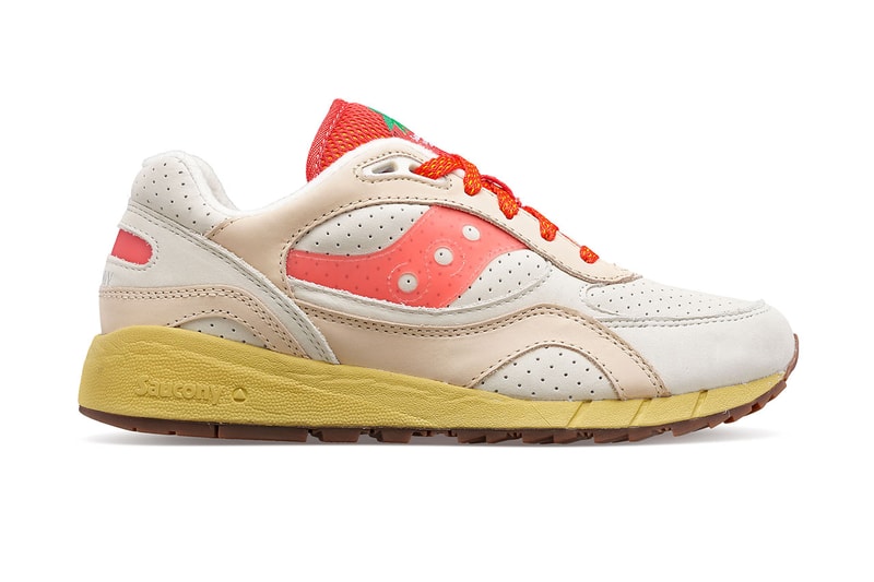Saucony never strays too far from the food world when it comes it crafting playful sneakers. In the past, we’ve seen the brand serve up an iteration inspired by avocado toast, an installment that channels the vibe of a pineapple and an offering inspired by a food fight, and now the American sportswear imprint has whipped up a brand new Shadow 6000 installment that’s influenced by the classic New York cheesecake.Ingredients from the sugary dessert are incorporated across the entire upper of the shoes. Its perforated leather build is generated with an off-white exterior, and this comes complemented by rosy pink overlays that are located on the quarter panels and the mudguards. The rear windows, Saucony logos, tongues and laces all come dripped in red to mimic the delectable strawberry glaze topping that is often associated with the post-dinner treat. Additionally, actual strawberry icons are placed onto the tongues which host Saucony branding as well as in all-over fashion across the insoles. Down below, the yellow and brown bottoms are designed to portray graham cracker crust.Parties who are interested in picking up a pair can find these available now via Saucony for $140 USD.In other news, Saucony recently teamed up with TOMBOGO for a new collaboration.