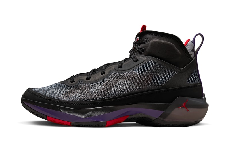 As the NBA season begins this month, various NBA-themed colorways that Nike and Jordan Brand are known for have continued to be revealed. Recently, the LeBron 20 has been shown off in two “Lakers” looks alongside a Miami Heat colorway. Now, the Air Jordan 37 has been equipped with a Toronto Raptors color palette. This choice fits the silhouette’s theme of referencing the Air Jordan 7 as the sneaker’s OG “Raptors” colorway is well known as a pair Michael Jordan wore on court.In this “Raptors” look, the Air Jordan 37 returns with its signature Lenoweave upper in black, similar to the all-black nubuck upper found on the Air Jordan 7 “Raptors.” The team’s classic purple that has lessened in usage since the organization’s rebrand arrives on the midsole and heel tab. Hits of red appear on the lining, various Jumpman logos, tongue and sole unit to continue to the theme. Rounding out this pair, key tech specifications include Formula 23 cushioning at the sole unit, a TPU mold at the heel, a Zoom Air strobel unit and a carbon fiber midfoot shank.Release for the Air Jordan 37 “Raptors” is scheduled for October 13 at a price of $185 USD via Nike and select retailers worldwide.In other footwear news, Zion Williamson’s Air Jordan 1 Low OG “Voodoo” has now been officially revealed by Nike ahead of its holiday release.